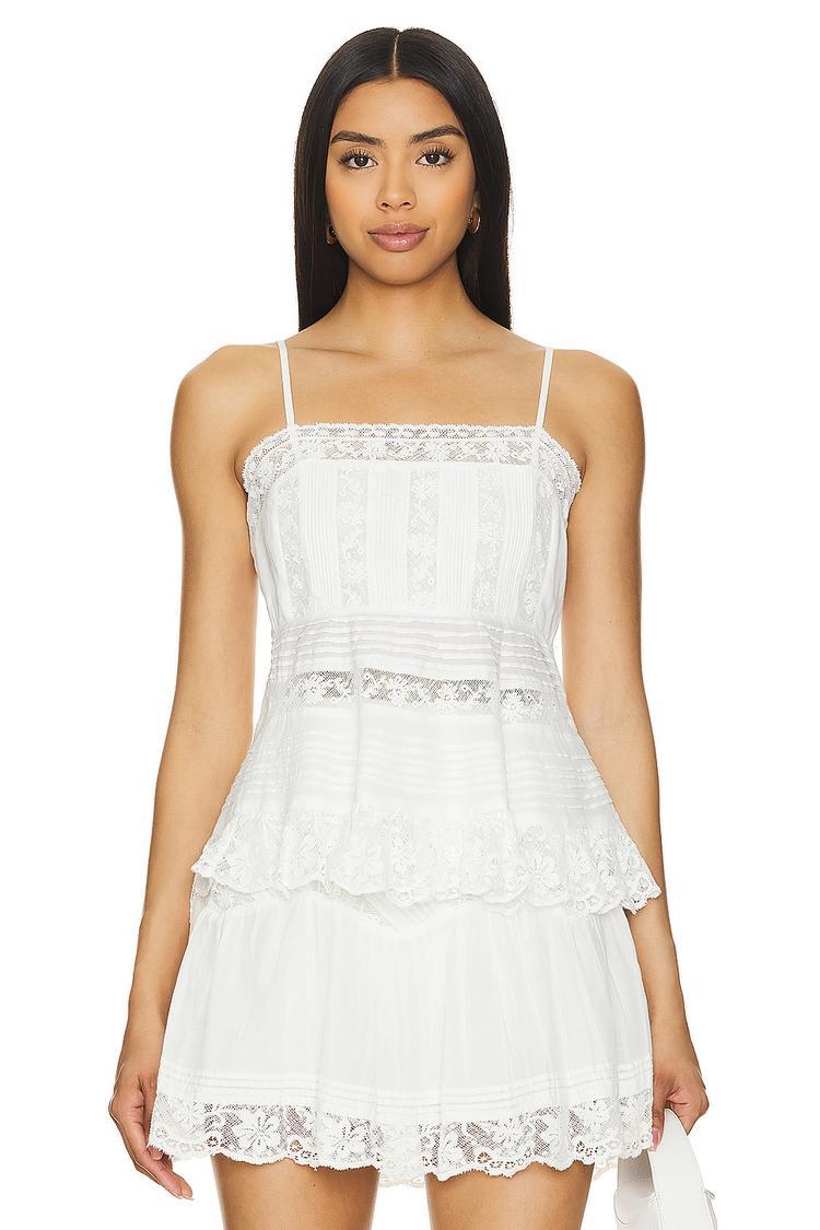 Delicate voile cotton crafted with intricate lace trim and ruffles defines this romantic camisole top. Featuring adjustable spaghetti straps and a straight neckline, it offers a relaxed fit that falls to hip length with a charming hem detail. The all-over lace and ruffle accents create a dreamy bohemian vibe perfect for spring and summer days. Ideal for casual outings, brunch dates, or vacation wear, this lightweight cotton piece blends comfort and style effortlessly.