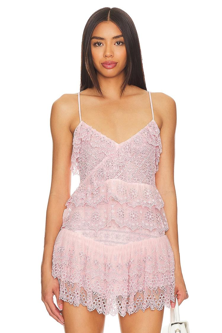 Delicate and feminine, this light pink camisole features a ruffled V-neckline and tiered ruffled styling crafted from semi-sheer mesh and eyelet fabric. The regular fit and spaghetti straps create an airy, romantic silhouette perfect for spring and summer days. Snap button closure at the side adds a subtle functional touch. Ideal for casual outings, brunches, date nights, or vacation wear, this hip-length top brings a soft bohemian charm to your wardrobe with its intricate lace-like texture and layered design.
