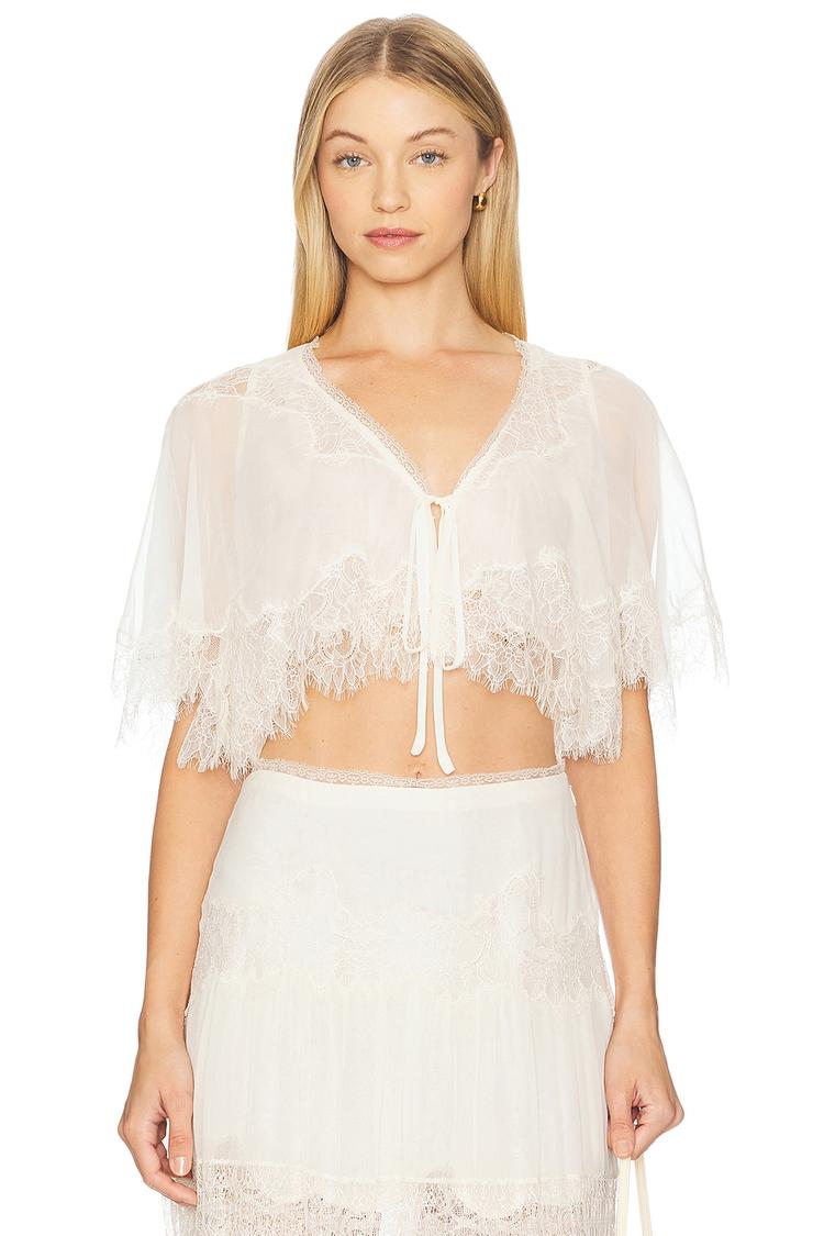 Delicate scalloped lace trims and lightweight silk chiffon define this cropped Thessia Top in an elegant off-white hue. The semi-sheer fabric gently drapes over the body with a slim fit, featuring a flattering V-neckline and half sleeves for a romantic and chic silhouette. A front tie closure adds a subtle decorative touch. Ideal for spring and summer, this versatile top is perfect for casual outings, brunch dates, or romantic evenings, offering a luxurious yet airy feel that elevates any ensemble.