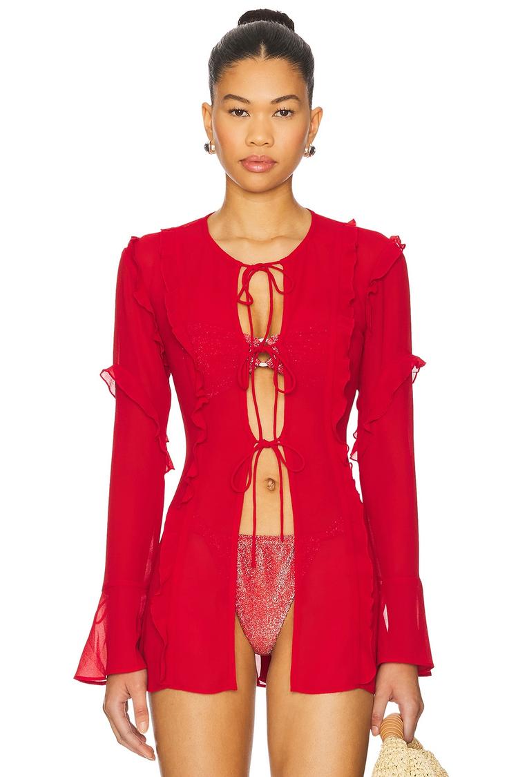 Romantic ruffles and delicate flounce sleeves define this red chiffon blouson top with a relaxed fit. The sheer, lightweight fabric and mid-hip length offer an airy silhouette, enhanced by front self-tie closures and tie straps at the cuffs. Its round neckline and long sleeves create a versatile piece perfect for casual brunches, date nights, or relaxed spring and summer days. The intentional sheerness adds a subtle sensuality, making it an elegant yet easy-to-wear choice for warm weather occasions.