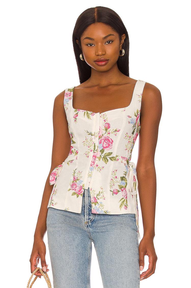 Effortless romance meets warm-weather ease in the Bambi Top by LPA. This sleeveless floral peplum combines a square neckline with a lightweight linen blend (55% linen, 45% rayon) in a creamy ivory base, adorned with pink roses and fresh green leaves. A concealed front zipper provides a smooth, structured fit, while attached side ties add playful, shaping detail to the peplum silhouette. Ideal for brunch, vacations, or everyday city strolls, it pairs beautifully with light-wash denim or a midi skirt for day-to-night versatility. Breathable, flattering, and quietly chic—the perfect sunny-season staple.