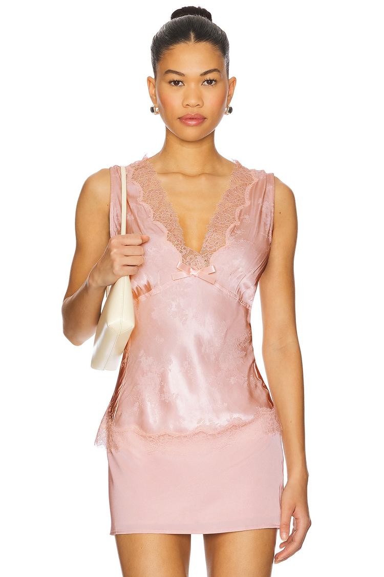 Soft shimmer and delicate lace trim define this fitted tank top in a dusty rose hue. Crafted from lightweight jacquard viscose, its sleeveless silhouette features a flattering V-neck and concealed back zipper with hook and eye closure for a sleek finish. The hip-length design offers versatile elegance, ideal for spring and summer occasions like brunch, date nights, and nights out. This chic piece balances sophistication with a subtle romantic touch for a refined yet approachable look.