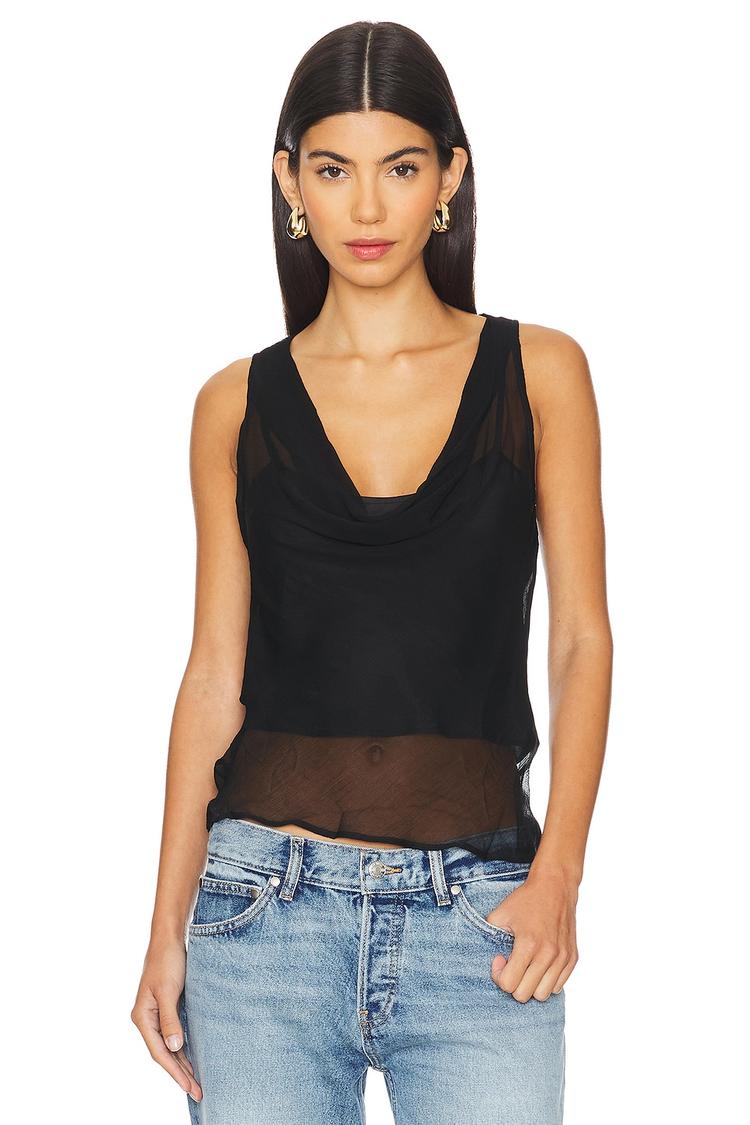 Sheer chiffon panels paired with a draped neckline bring a modern, sexy edge to this slim-fit tank top. Crafted from lightweight viscose and polyester chiffon, it features wide straps and a waist-length hem that enhances its versatile appeal. Ideal for spring and summer, this sleek black top is perfect for casual days, brunch outings, or night events where effortless chic is key.