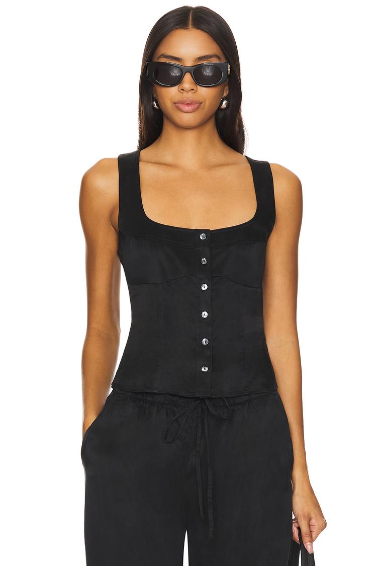 Matte black viscose with a sleek satin finish defines this fitted corset top featuring a square neckline and wide straps for a flattering sleeveless silhouette. The front button closure adds subtle detailing while the waist length cut enhances its minimalist chic style. Ideal for casual days, brunches, or date nights, this versatile piece blends comfort and elegance seamlessly, making it a standout choice for night outs and everyday wear.