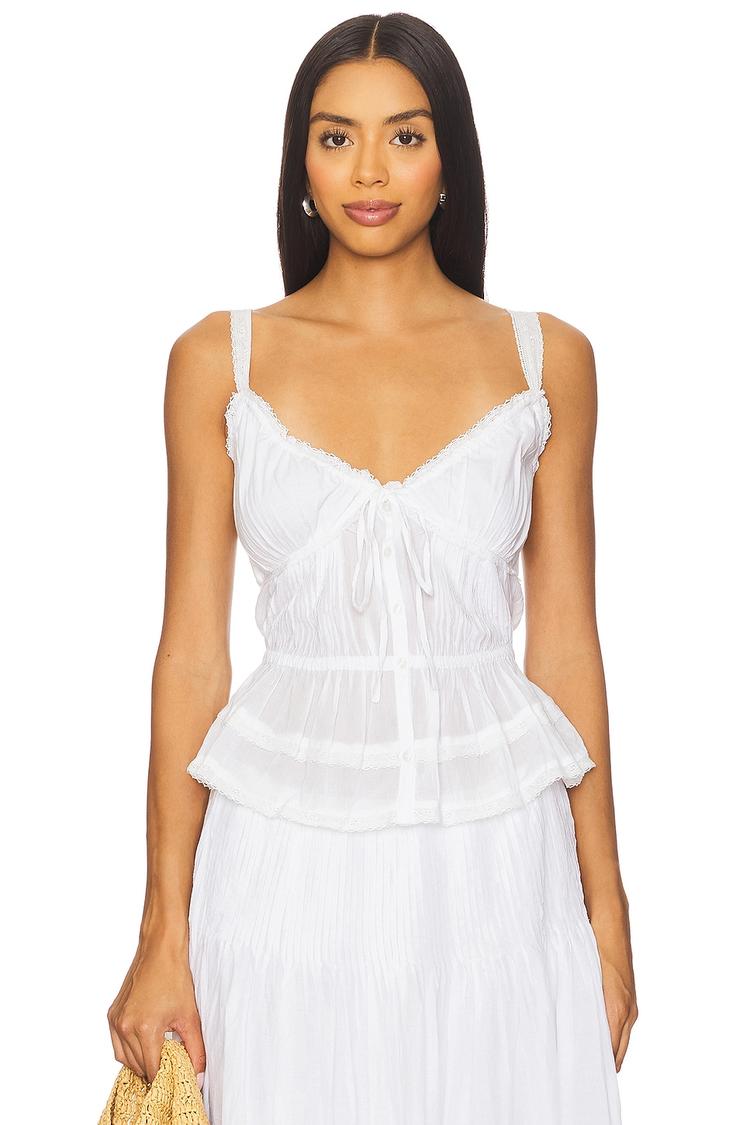 Soft cotton voile and delicate lace trim create a romantic and fitted camisole with a flattering sweetheart neckline and wide straps. The waist-length silhouette features front button closure accented by a tie-up detail, enhancing its casual chic appeal. Light ruffles add feminine charm along the hem and bodice, making it ideal for warm spring and summer days. Perfect for casual outings, brunches, and vacations, this Emmy Top balances comfort with elegant detailing for versatile styling.