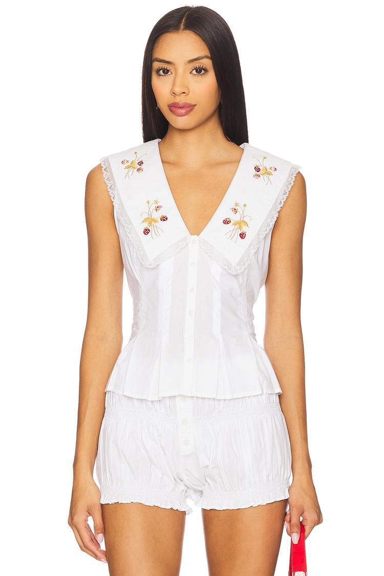 Lightweight pleated cotton poplin fabric shapes this fitted shell top, featuring a flattering V-neck and delicate cap sleeves. Embroidered floral details and lace trim at the collar add a romantic touch, elevating its classic white silhouette. Front button closure enhances the tailored look, making it ideal for casual brunches, everyday wear, or spring and summer outings. The waist-length hem complements a feminine profile, perfect for pairing with shorts or skirts for a fresh, elegant style.