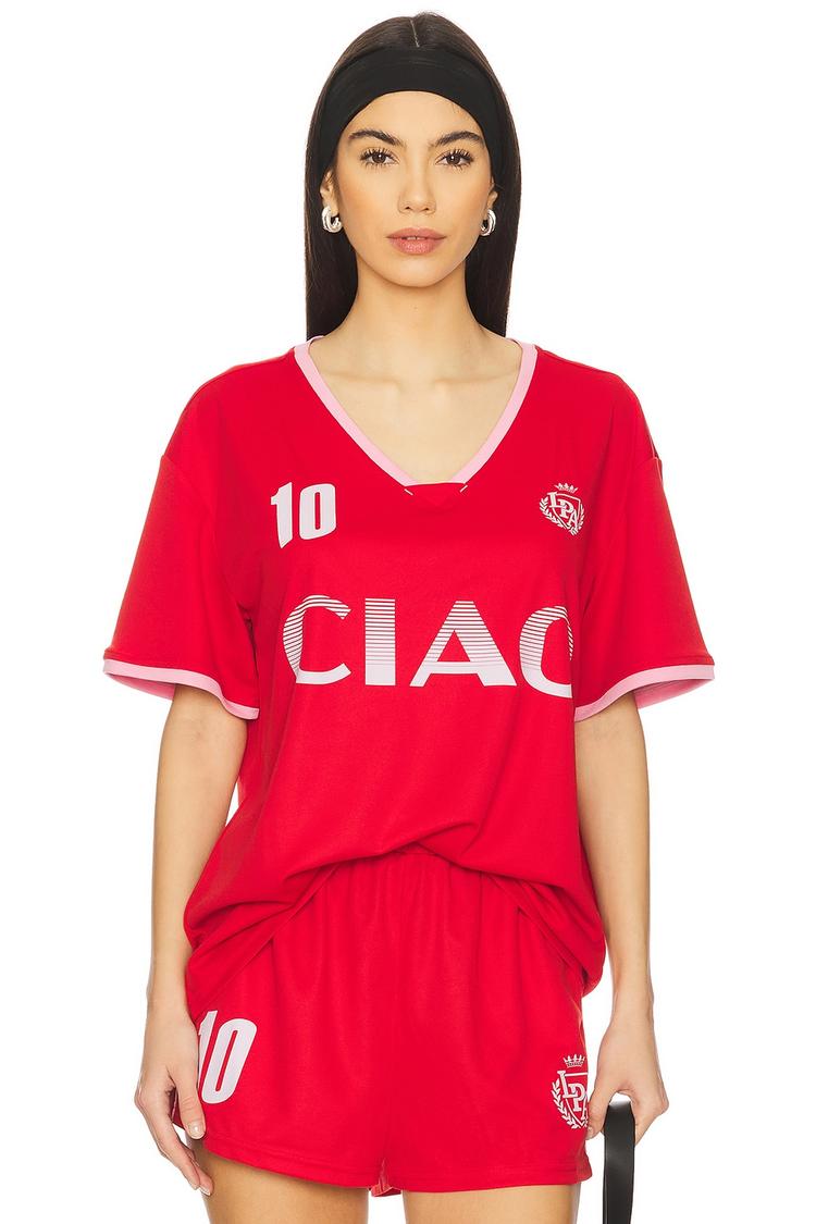 Bright red midweight pique polyester fabric defines this sporty chic jersey top with a loose fit and hip length silhouette. Featuring a V-neck and half sleeves with white trim accents, the pullover style offers casual comfort. The front sports a bold white graphic print, perfect for casual streetwear, everyday wear, or weekend outings. Its breathable fabric and relaxed cut make it ideal for spring and summer occasions, combining trendy and casual chic vibes effortlessly.