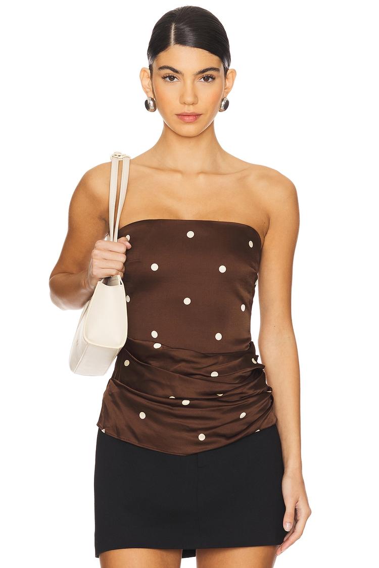 Lightweight and sleek, this fitted bandeau corset top in matte brown satin fabric features a straight neckline and strapless sleeveless design. Adorned with white polka dots all over and subtle ruching detail, it offers a flattering hip-length silhouette with a hidden side zipper for a smooth finish. Perfect for spring and summer nights out, date nights, or casual chic occasions, this modern top blends comfort with eye-catching style.