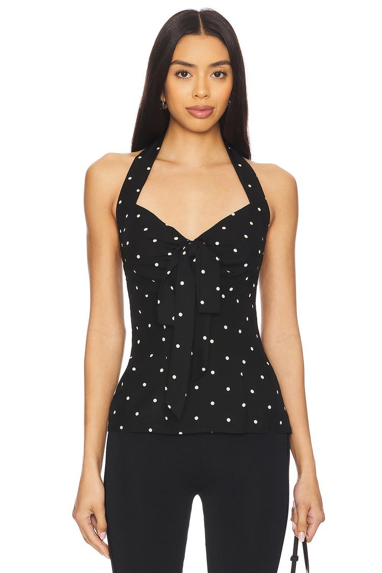 The Romi Halter Top features a fitted silhouette crafted from midweight challis fabric blending viscose and lyocell for a soft, smooth feel. Its classic black base is adorned with a timeless white polka dot pattern all over, complemented by a flattering sweetheart neckline and sleeveless, strapless styling. The waist-length cut and hidden back zip with hook and eye closure create a sleek finish, while the knot accent at the center front adds a subtle decorative touch. Ideal for casual outings, brunches, or date nights, this chic camisole brings effortless style to warm-weather wardrobes.
