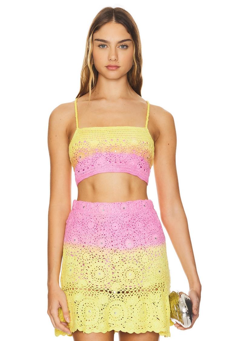Lightweight crochet and vibrant bright yellow and pink hues create a fitted, cropped silhouette with delicate spaghetti straps and a straight neckline. The back features a stylish lace-up tie closure, accentuating the bohemian and casual chic vibe. Crystal embellishments add subtle sparkle across the entire top, making it a perfect choice for beach days, vacations, brunch dates, or casual summer outings. Crafted from breathable cotton with nylon and spandex for a comfortable stretch, this top balances trendy design with effortless wearability for warm weather seasons.