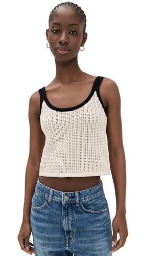 Feel-good everyday chic in Madewell's Open Stitch Sweater Tank in Sand and Black. This lightweight cotton knit tank features an airy open-knit texture with a contrasting black trim along the scoop neckline and straps, creating a modern, two-tone vibe. Cropped silhouette sits at the high waist, highlighting your denim or skirt. The sleeveless, scoop-neck design offers breezy comfort for warm days, easy layering under a blazer or denim jacket. Versatile for casual weekends, brunch, or a vacation getaway; pair with high-waisted jeans, shorts, or a flowy skirt for different looks. A effortlessly stylish piece that blends comfort with contemporary detail.