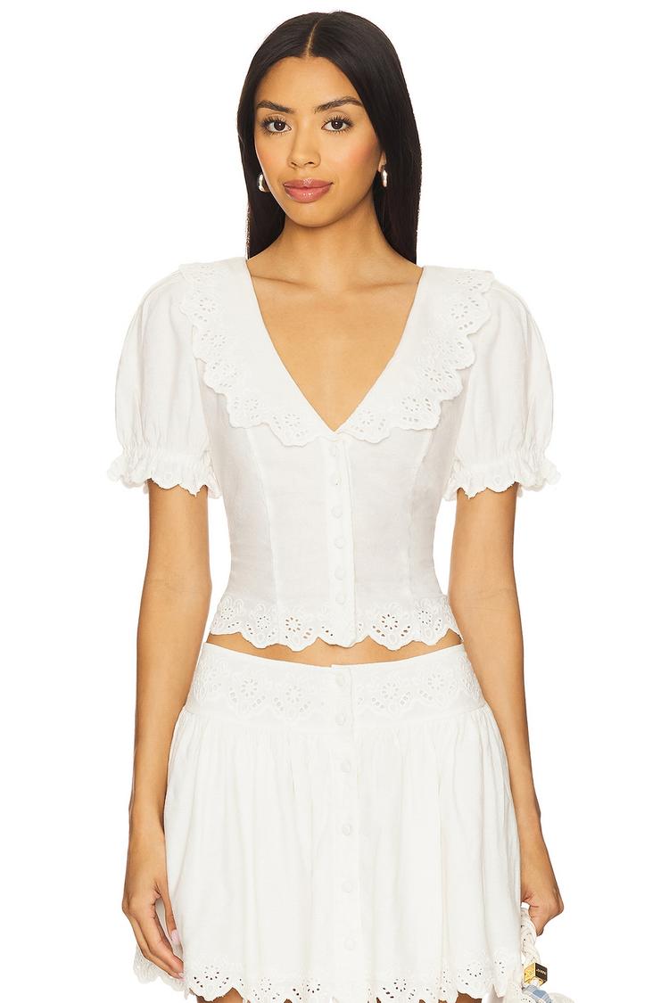 Delicate eyelet embroidery and soft ruffles define this fitted blouson top crafted from a breathable cotton-linen blend. The V-neckline and half-length blouson sleeves add a romantic touch, while the waist-length silhouette with scalloped hem creates a flattering shape. Perfect for spring and summer, this versatile piece is ideal for casual outings, brunch dates, and vacation days. The front button closure enhances its classic charm, making it an effortlessly chic addition to your warm-weather wardrobe.