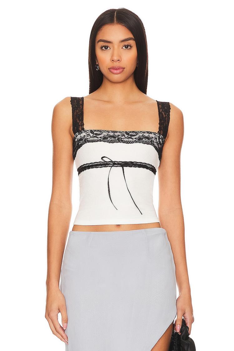 Soft knit fabric combined with delicate black lace detailing along the square neckline and wide shoulder straps creates an elegant, feminine silhouette in this fitted cropped tank top. The satin drawstring tie under the bust adds a charming touch and adjustable fit. Perfect for spring and summer days, this romantic piece transitions seamlessly from casual brunches to date nights and everyday wear, embodying sweet girl-next-door charm with a modern edge.
