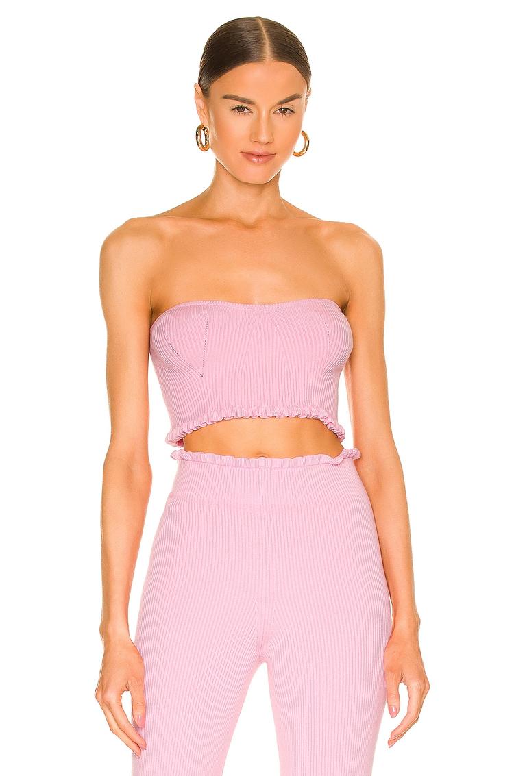 Feel carefree and chic in Majorelle’s Cropped Sweetheart Ribbed Tube Top in soft pink. Crafted from a lightweight cotton–viscose–spandex knit for a breathable, snug stretch that moves with you. The strapless tube silhouette features a flattering sweetheart neckline, a cropped length, and playful lettuce-edge trim at the neckline and hem for subtle texture. A pull-on style with no hardware ensures a clean, sleek look that pairs beautifully with high-rise bottoms for day-to-night versatility. Ideal for brunch, beach days, or warm-weather adventures—easy to style up with jewelry and sandals for a polished, modern mood.