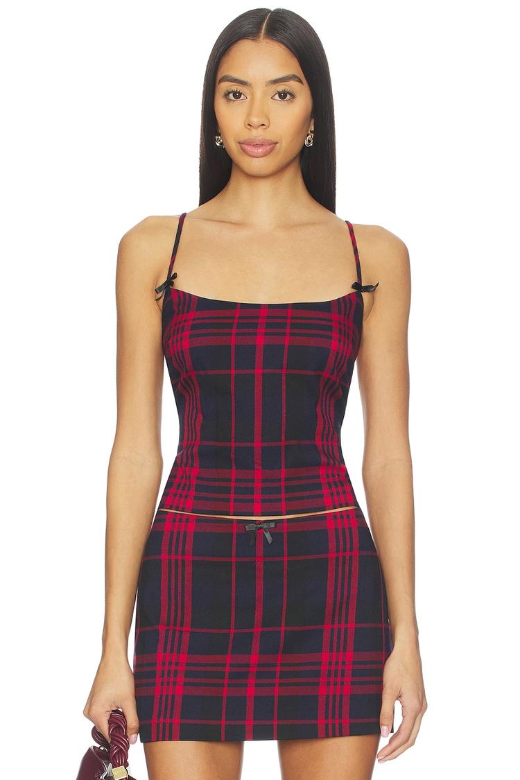 Bold red and black checkered twill fabric shapes this fitted cropped top with a square neckline and slender spaghetti straps. The hidden back zipper ensures a smooth silhouette while front bow detailing adds a subtle feminine touch. Midweight polyester-viscose blend provides comfortable structure, making it ideal for casual outings, date nights, or a night out with friends. This classic yet trendy piece offers versatile style that pairs effortlessly with high-waisted bottoms for a confident, contemporary look.