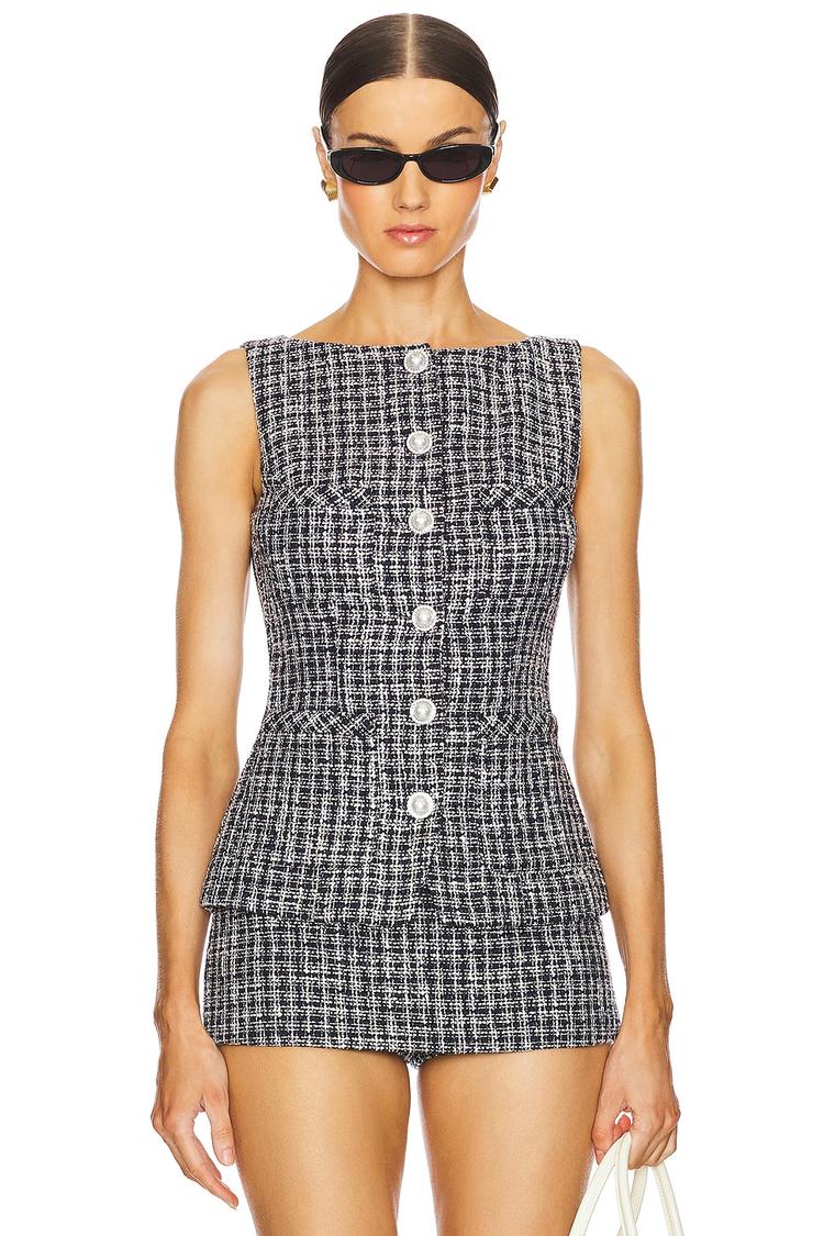 Classic checkered shell top crafted from a twill blend of polyester, acrylic, viscose, and elastane offers a fitted silhouette that flatters the waist. Featuring a sleeveless design with a round neckline and a front button closure, this waist-length top is versatile for casual outings, brunches, and business casual settings. The monochrome black and white pattern adds timeless sophistication, while the tailored fit and clean lines create a polished look perfect for workwear and everyday style.