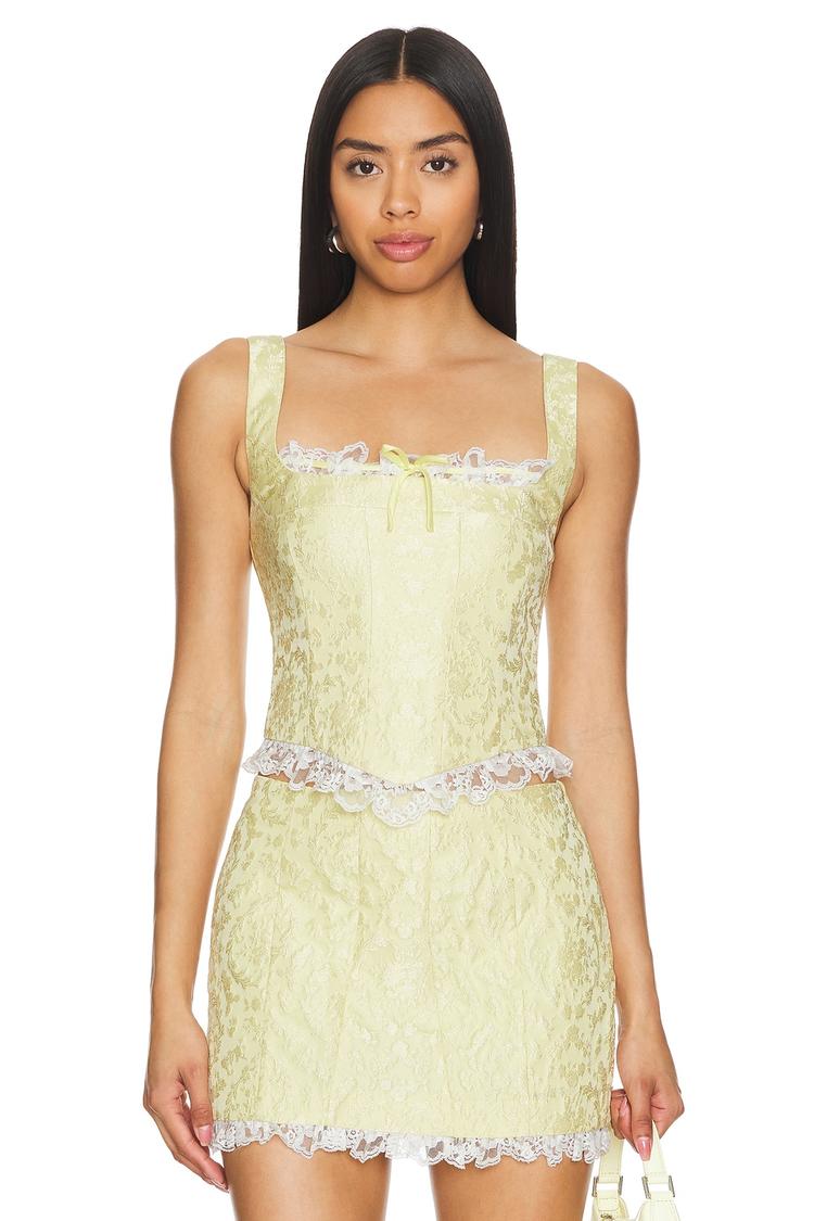 Delicate brocade fabric and structured boning shape this fitted corset top in a soft matte light yellow hue. Featuring a square neckline trimmed with lace and a subtle drawstring ribbon detail, its sleeveless design with wide straps and back zipper closure provides a flattering silhouette at waist length. This romantic and elegant piece is perfect for spring and summer occasions like brunch, date nights, or casual evenings out, delivering chic style with a polished finish.