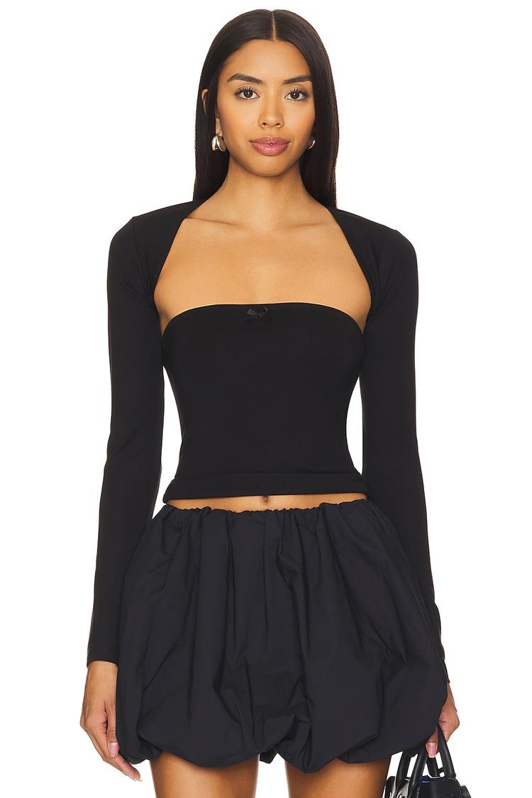 Sophisticated and figure-hugging, this black cropped top features a strapless neckline paired with long regular sleeves, creating a modern silhouette perfect for evening events. Crafted from a midweight knit blend of viscose, nylon, and elastane, it offers both comfort and stretch. The open back adds a daring edge, while the detachable shrug allows versatile styling options. Ideal for casual outings, date nights, and night outs, this fitted piece balances sexiness with contemporary chic.