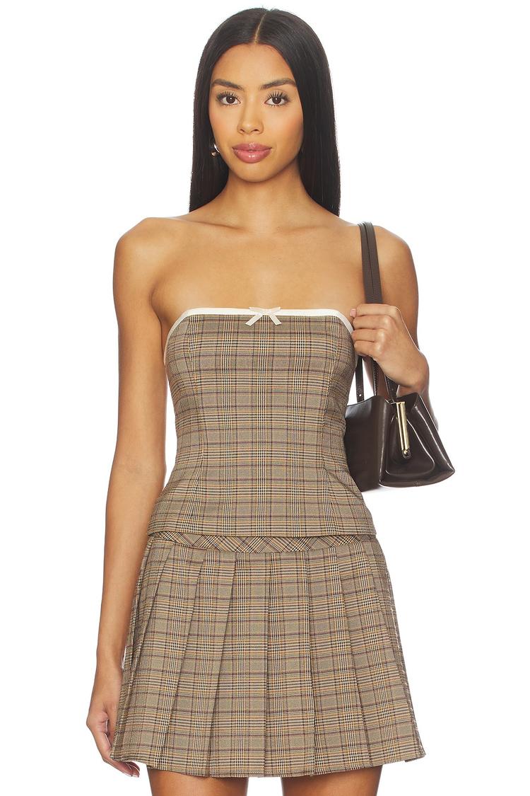 A fitted bandeau top crafted from smooth polyester features an all-over checkered pattern in warm brown tones with contrasting black and beige lines. The straight neckline is highlighted by a delicate off-white bow at the front, adding a subtle feminine touch. Its strapless, sleeveless design and cropped length make it ideal for warm spring and summer days. Perfectly suited for casual outings, brunches, or a stylish night out, this minimalist chic piece pairs effortlessly with various bottoms and elevates your seasonal wardrobe.