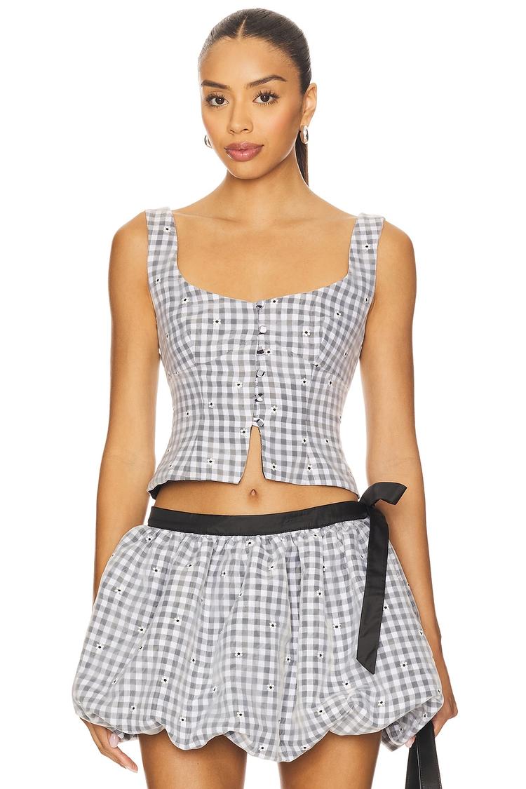 Lightweight polyester poplin with a delicate mesh overlay defines this fitted bralette top featuring a timeless checkered pattern in white and gray. The cropped length and sleeveless design with wide straps and a square neckline bring a fresh, modern vibe. Front button loop closures add a charming detail to the bustier silhouette. Ideal for warm spring and summer days, this versatile piece transitions effortlessly from casual brunches to relaxed date nights with a chic, casual flair.