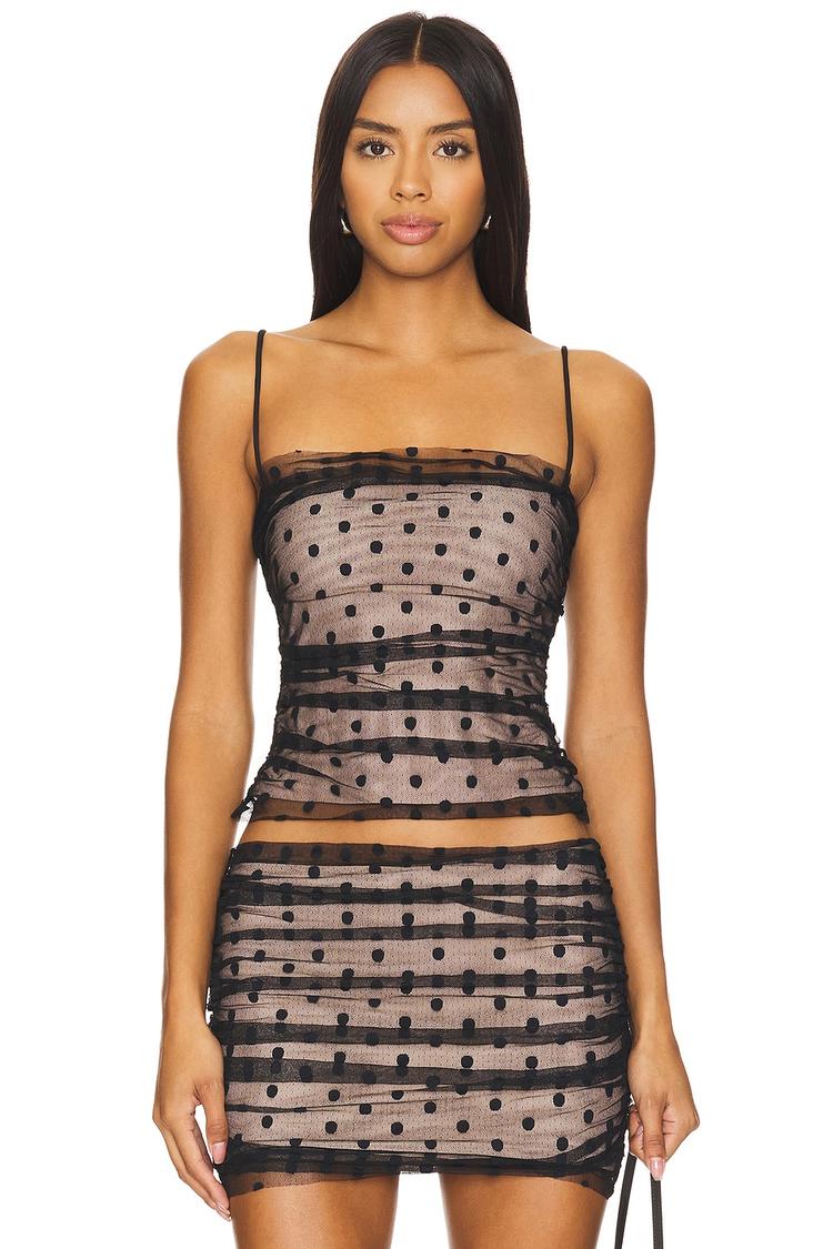 Ruched mesh fabric and sheer panels combine with a fitted silhouette in this sexy Nicola Camisole top. Featuring a straight neckline and delicate spaghetti straps, it showcases a playful polka dot and stripe pattern all over in matte black atop a nude base. The hidden side zipper closure ensures a smooth fit, perfect for spring and summer nights out, date nights, or party occasions. This modern and trendy piece pairs effortlessly with skirts or pants for a bold, confident look.