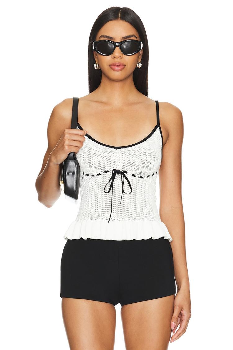 Soft and semi-sheer viscose blend fabric shapes this slim-fit tank top with delicate spaghetti straps and a flattering U-neckline. The white base is accented by black piping and a tie-up detail at the front, highlighting its minimalist charm. Finished with subtle ruffles along the hem, this waist-length tank offers a breezy silhouette perfect for spring and summer days. Ideal for casual outings, brunch dates, or relaxed evenings, it pairs effortlessly with shorts or skirts, making it a versatile addition to your warm-weather wardrobe.