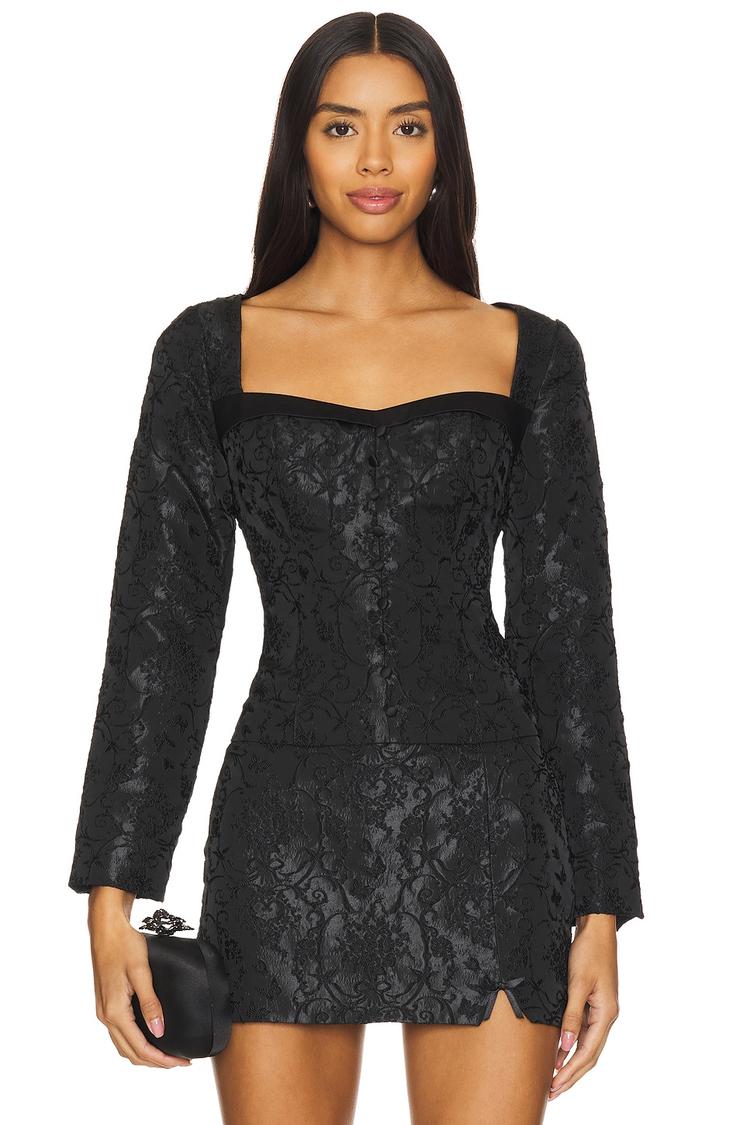 A textured black lace brocade fabric shapes this fitted blouson with a sophisticated square neckline and long sleeves. The thigh-length silhouette and hidden back zipper closure add to its elegant and chic appeal, perfect for semi-formal occasions, cocktail parties, and night outs. This top combines refined floral texture and a sleek matte black base, offering a versatile piece that enhances your autumn and winter wardrobe with quiet luxury.
