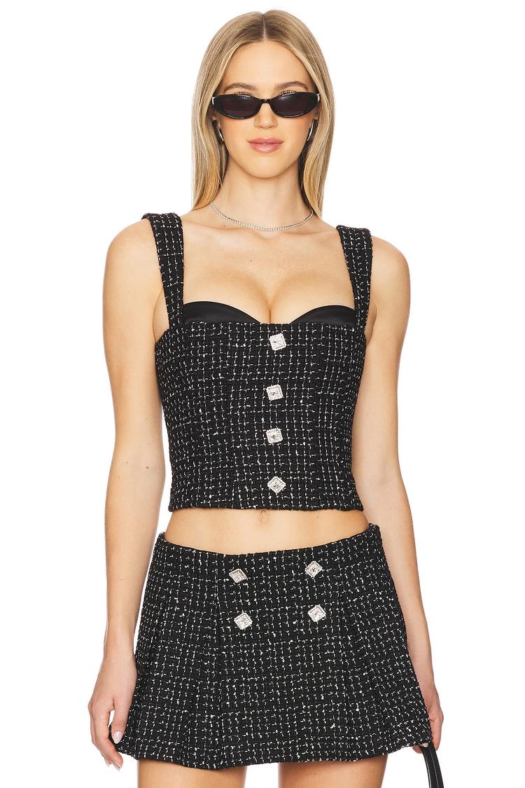 This fitted cropped corset top features a classic black tweed fabric with a structured boned bodice that sculpts the silhouette beautifully. The wide straps and sweetheart neckline frame the décolletage with a peekaboo satin bust detail, enhanced by front crystal-embellished buttons for a touch of elegance. Designed with a covered back and hook closure, it offers a sophisticated look perfect for casual outings, brunch dates, or night outs during autumn and winter. Combining timeless chic with modern edge, this top elevates any ensemble with its polished style and luxe fabric blend.