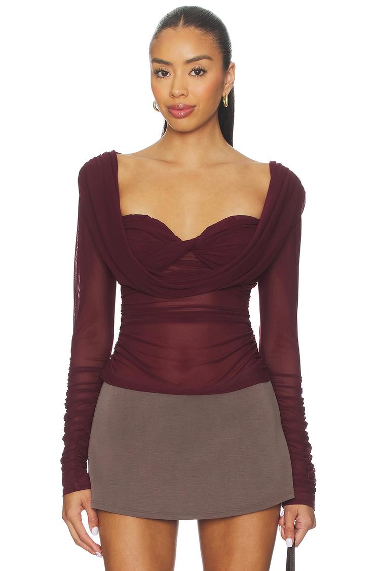 Sheer mesh fabric and a slim fit define this matte burgundy corset top with a flattering sweetheart neckline and long sleeves. The pullover design ensures easy wear, while the waist-length silhouette creates a chic, modern look perfect for night outs, date nights, and girls' nights. Its sophisticated sheer panels add subtle allure, making it a standout piece for stylish evening occasions.