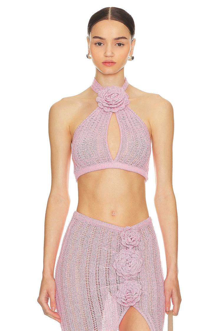 Delicate crochet knit and a halter neck tie create a romantic, fitted cropped tank perfect for spring and summer. The standout pink rosette applique at the neckline adds a feminine touch, while the bust cut-out enhances its chic, bohemian vibe. Ideal for casual beach days, vacation getaways, or relaxed weekend outings, this Stella Rosette Top combines breathable knit fabric with a flattering silhouette that elevates any warm-weather wardrobe.