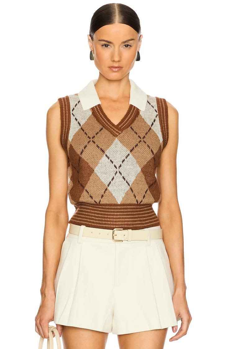 Feel the easy confidence of a sporty-chic vibe with the Renee Top. This cropped sleeveless knit blends a warm argyle pattern in Brown, Beige, and Cream with a crisp white collar for a vintage-polo twist. Crafted in lightweight acrylic, it wears like a feather yet keeps its shape with ribbed trim at the hem. The V-neck and close-fitting silhouette create a flattering, modern lines that pair effortlessly with high-waisted creams or denim. Ideal for casual weekends, golf-inspired looks, vacations, or street-style days that crave preppy polish with effortless ease.