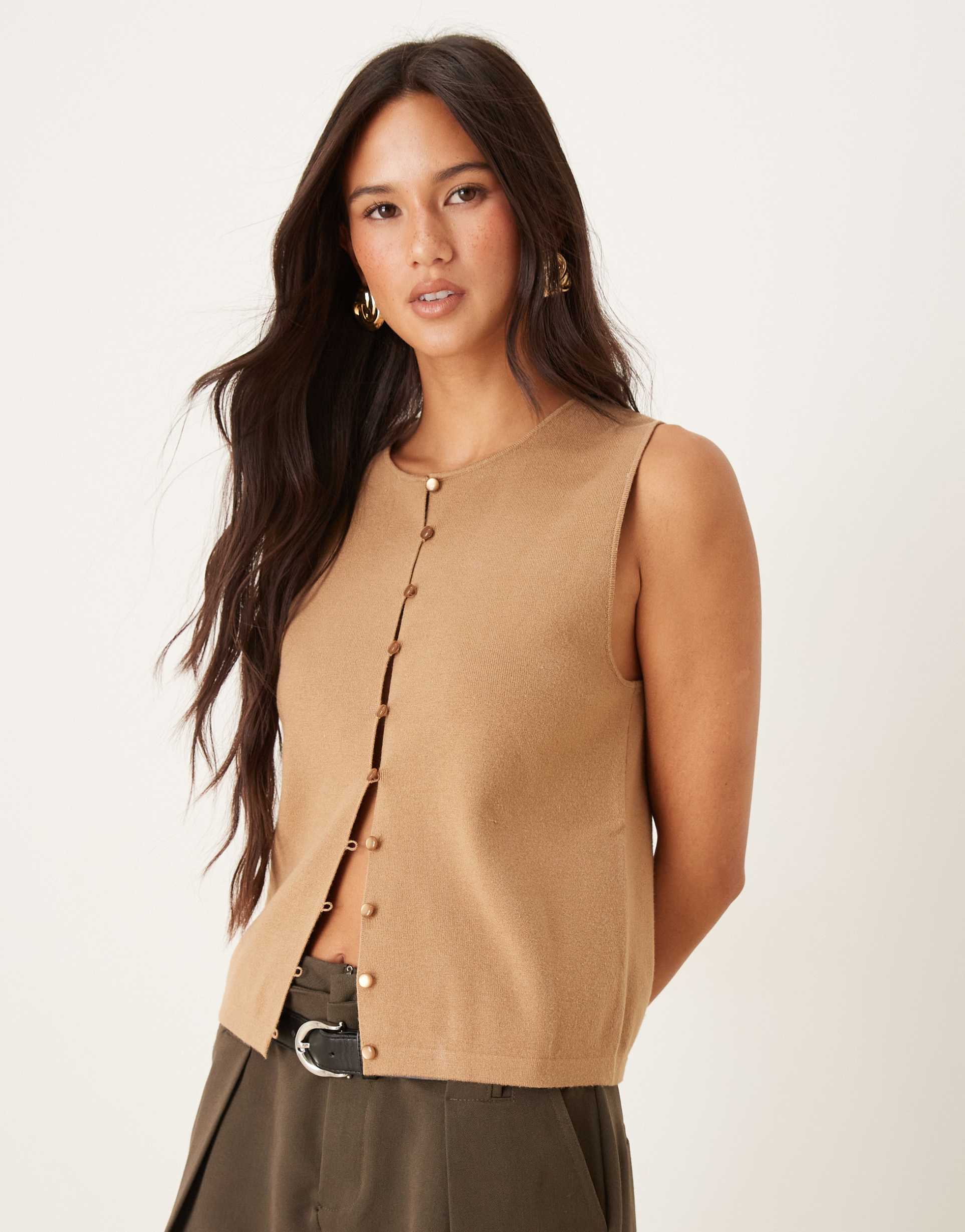 Soft mocha hues and a fine knit texture define this sleeveless tank top, featuring a classic round neckline and a looped button placket that adds subtle charm. Its regular fit and hip-length hemline create a versatile silhouette perfect for layering or wearing solo. Crafted from a smooth blend of viscose, polyester, and polyamide, this minimalist piece suits casual days, workwear, and business casual settings with effortless style.