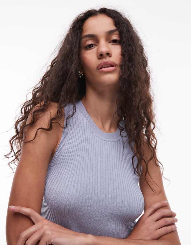 MANGO FINE RIBBED LINEN MIX TANK TOP IN PALE BLUE