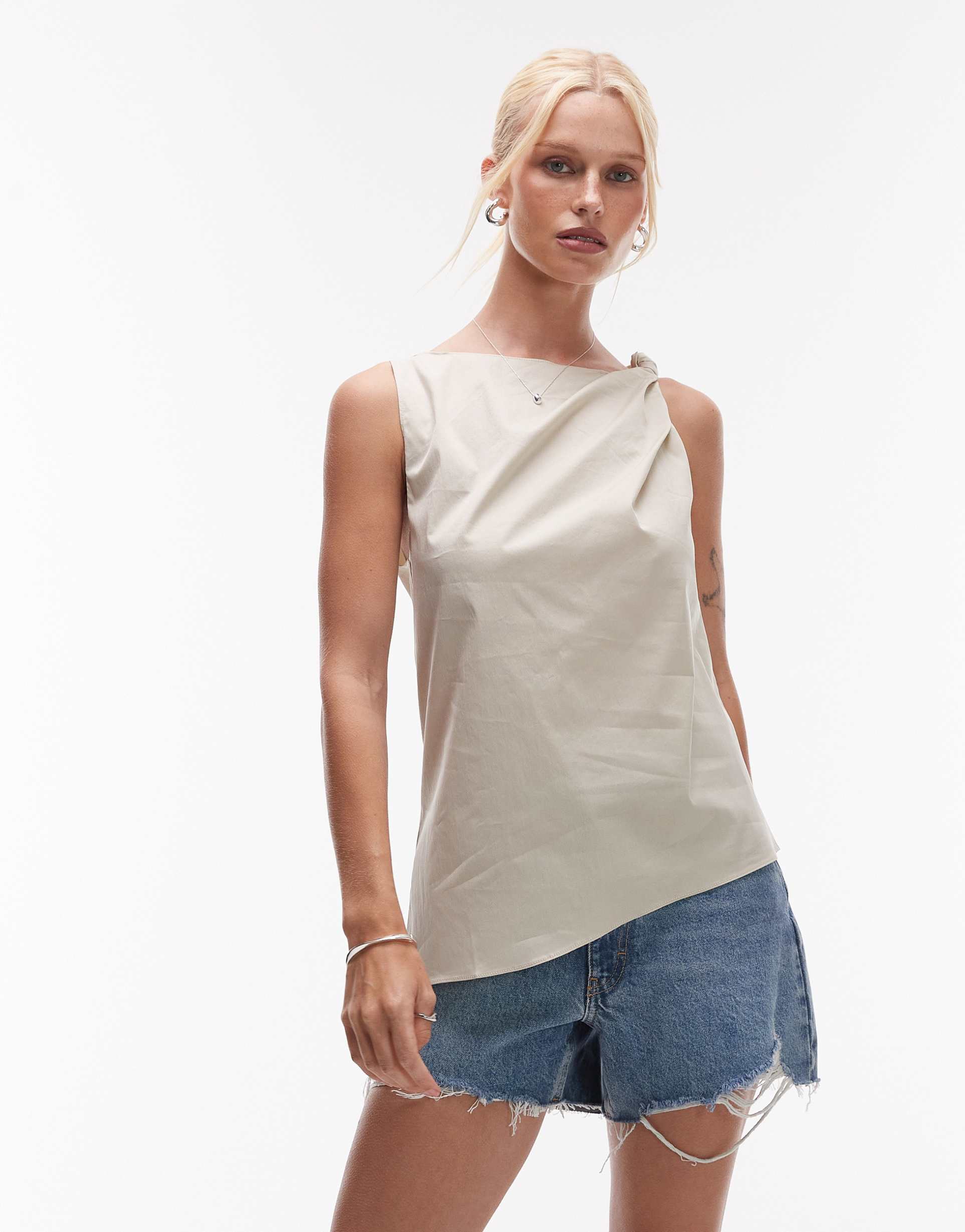 Soft cream fabric with a subtle sheen defines this sleeveless asymmetric top featuring a knotted detail on one shoulder. Its round neckline and regular fit offer comfortable wear, while the hip-length hem creates a modern silhouette. Crafted from a cotton-polyamide-elastane blend, it delivers breathable stretch ideal for warm spring and summer days. Perfect for casual outings, brunch with friends, or everyday wear, this minimalist yet chic top pairs effortlessly with denim or skirts for a relaxed, stylish look.