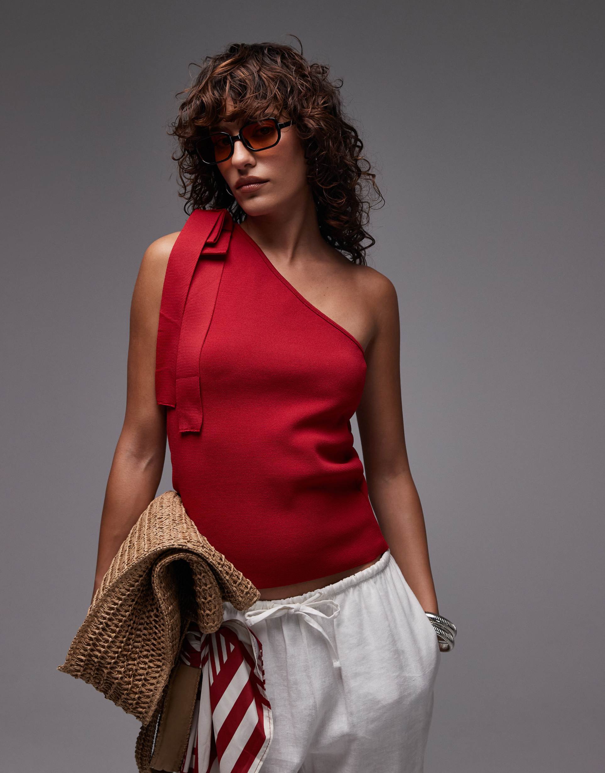 A sleek red knit tank with an asymmetric neckline and one-shoulder strap, featuring a charming bow detail on the front. Crafted from a fine viscose, polyamide, and polyester blend, this regular fit top offers breathable comfort and a smooth texture. Its sleeveless design and hip length make it an ideal choice for warm spring and summer days. Perfectly suited for casual outings, brunch dates, or evening occasions, this minimalist yet elegant piece brings effortless style and versatility to your wardrobe.