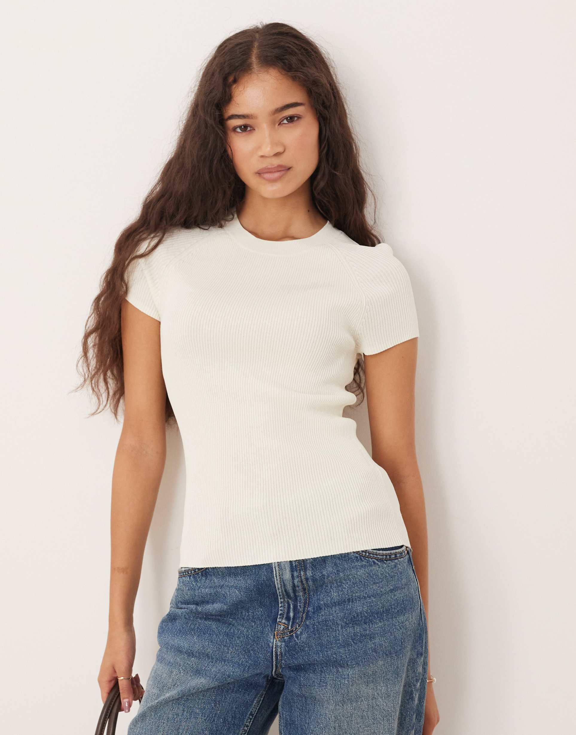MANGO ROUND NECK SHORT SLEEVE KNIT TOP IN WHITE