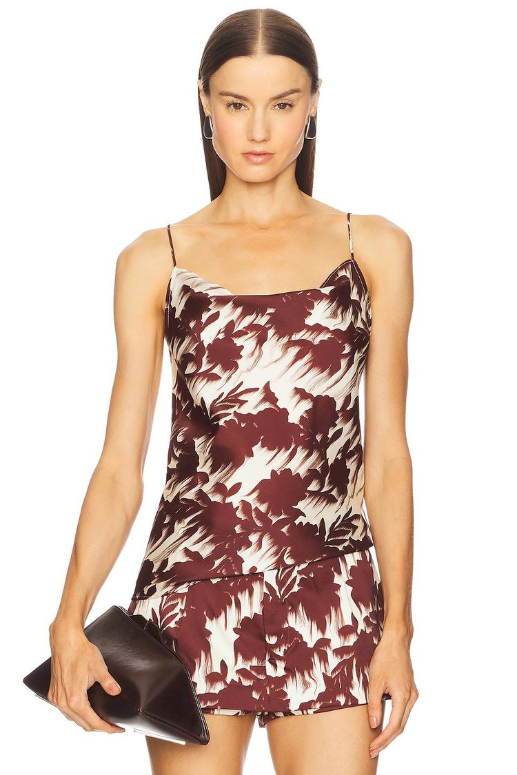 Softly draped satin fabric shapes this slim-fitting camisole with a captivating abstract print in matte white and dark red hues. Featuring delicate spaghetti straps and a graceful draped neckline, this hip-length top exudes a modern and chic vibe. Its lightweight polyester construction makes it ideal for spring and summer outings. Easily styled for casual days, brunch with friends, or a night out, this versatile piece adds a trendy edge to any wardrobe.