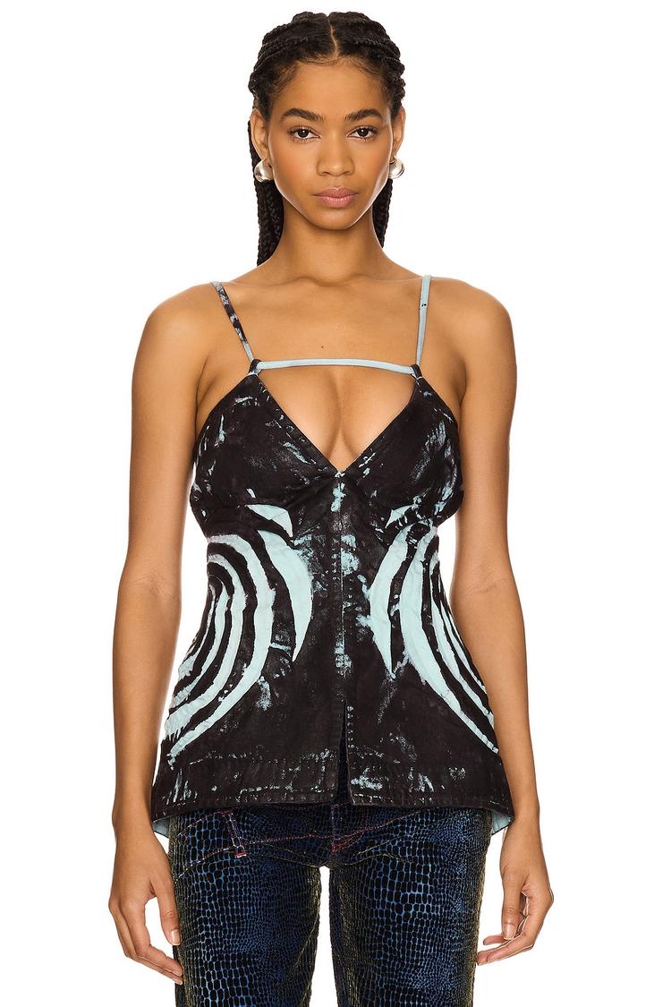 Abstract light blue swirls adorn this matte black camisole crafted from midweight cotton, offering a slim fit and hip-length silhouette. Adjustable spaghetti straps and a V-neckline enhance its edgy street style vibe, while a unique back button and tie-up closure provide a trendy finish. Perfect for summer nights, casual outings, or date nights, this top blends contemporary design with comfortable fabric for versatile wear.