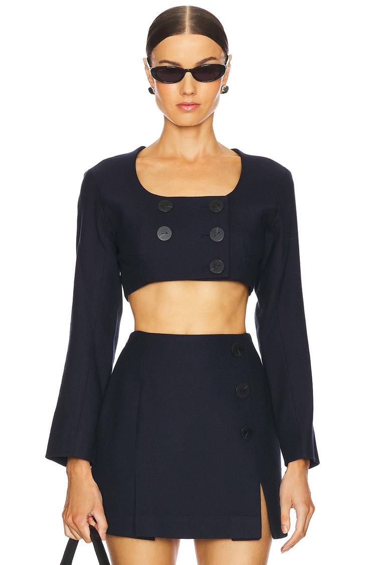Structured in a matte black twill blend of wool and polyester, this cropped top features a double-breasted button closure and a square neckline that frames the collarbone elegantly. The fitted silhouette and long regular sleeves create a polished, sophisticated look suitable for autumn and winter. Its versatile design is perfect for casual outings, business casual settings, or a stylish date night. The covered back and classic style lend a timeless chic vibe, making it an essential piece for refined layering or statement dressing.