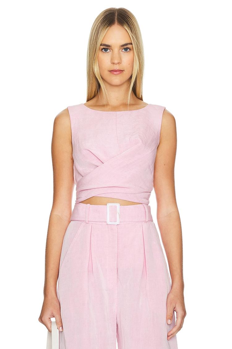 Softly tailored from a lightweight linen and viscose blend, this cropped wrap top in light pink offers a chic and minimalist vibe. Featuring wide straps and a flattering round neckline, it wraps neatly around the waist with a subtle tie detail at the back, complemented by a hidden zipper for a smooth finish. Its slim fit and sleeveless cut make it perfect for warm spring and summer days. Ideal for casual outings, brunch dates, or relaxed evenings, this versatile top pairs effortlessly with high-waisted trousers or skirts for a polished look.