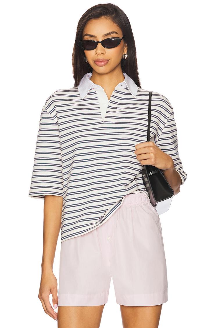 Soft midweight jersey fabric and a relaxed fit define this classic polo top, featuring a crisp white polo collar and half sleeves. The hip-length hem and subtle all-over gray stripes add a timeless, minimalist touch perfect for everyday wear, casual brunches, or business casual settings. With a front partial button closure, this Frankie Top offers versatile comfort and style that transitions seamlessly from spring through autumn.