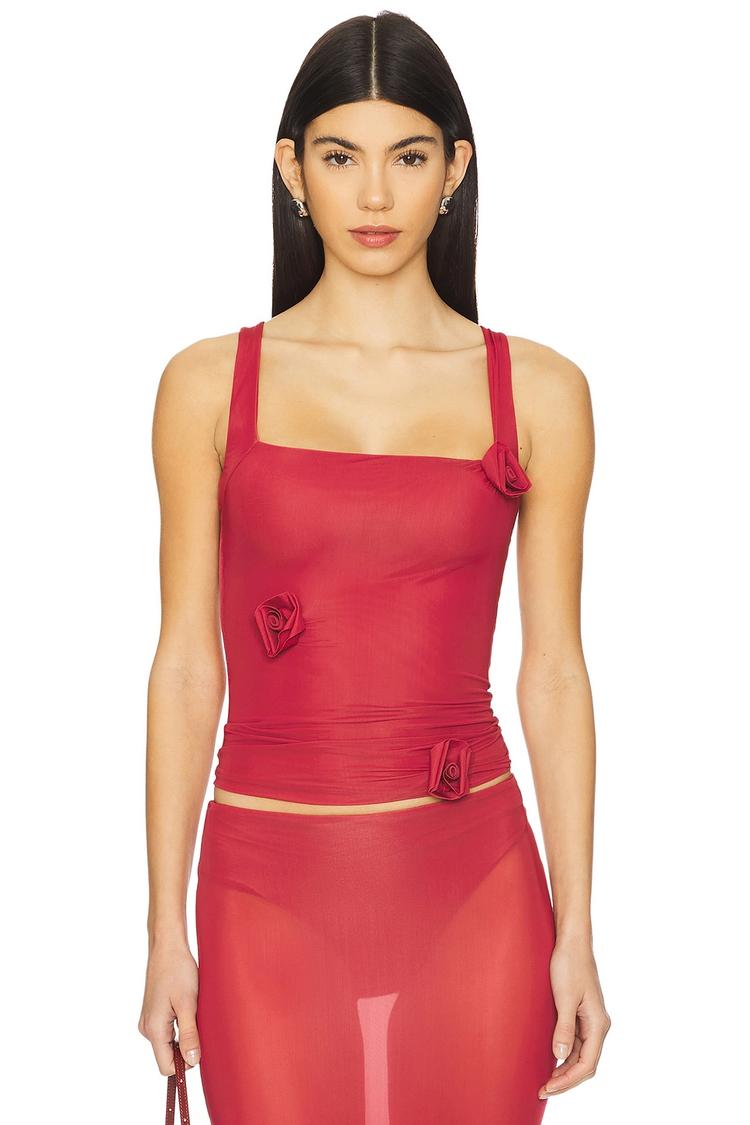 Lightweight and fitted with a sleek square neckline, this red tank top features wide straps and tonal rosette appliques on the front for a subtle decorative touch. Crafted from a smooth polyamide and elastane blend jersey fabric, it offers comfort and stretch, perfect for warm spring and summer days. The waist-length silhouette makes it versatile for casual outings, brunch dates, or elegant evening occasions, combining minimalist design with chic appeal. Easy to slip on and style, it effortlessly enhances any look with its refined simplicity and delicate floral accents.
