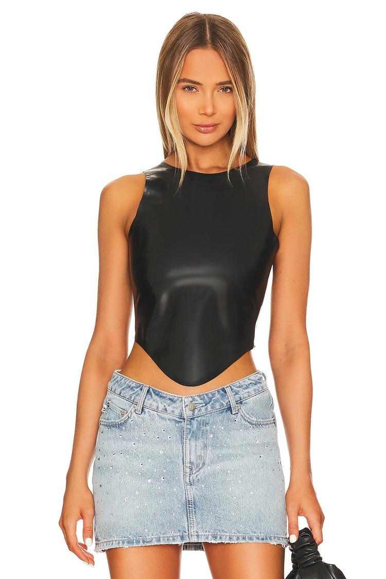 Sleek and bold, this fitted matte black tank top features a round neckline and wide straps for a modern edge. Crafted from stretchy elastane and polyurethane, it offers a smooth, second-skin feel. The standout kerchief hemline adds a unique asymmetrical flair, complemented by a concealed back zipper for a seamless finish. Perfect for summer and spring, this cropped tank is ideal for casual outings, night outs, and date nights, bringing a confident, edgy vibe to your wardrobe.