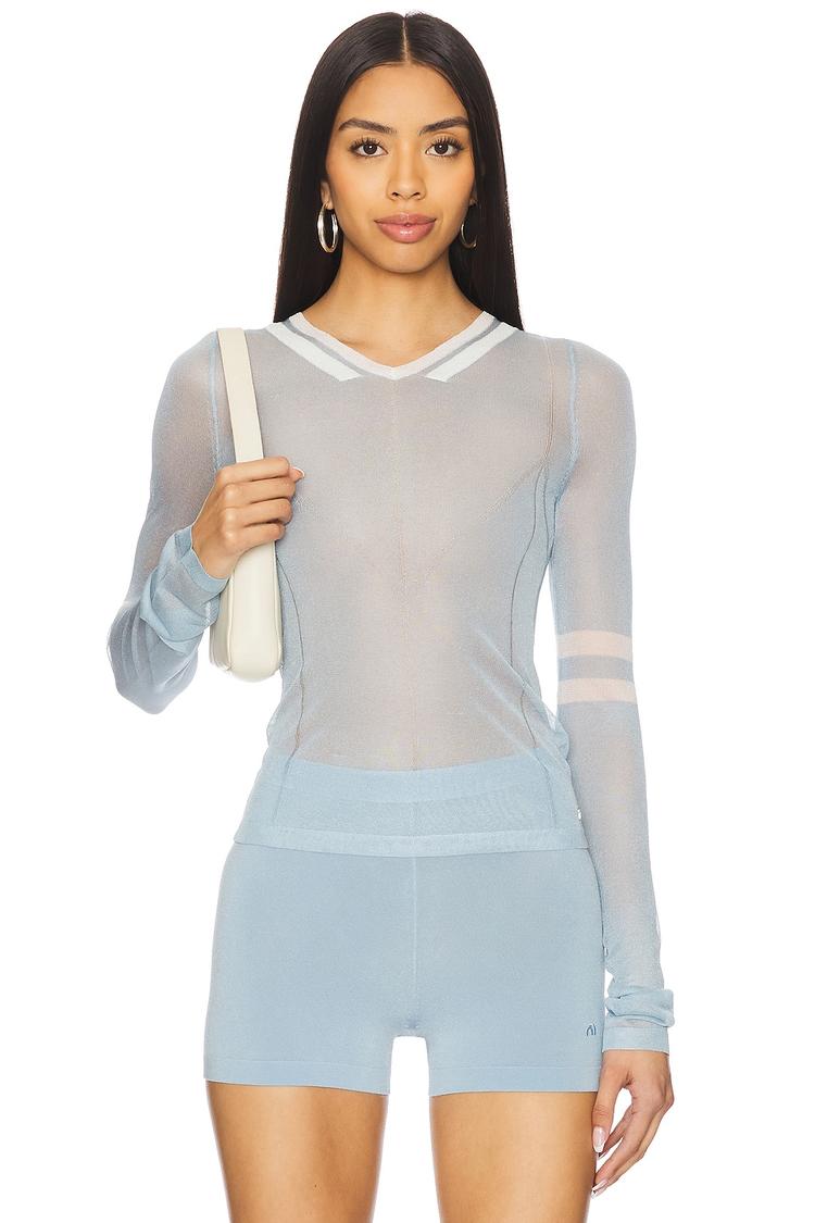 Delicate sheer mesh fabric and a slim fit combine in this Monica Shell top, featuring a flattering V-neck and extended long sleeves. The light blue hue adds a fresh, airy feel perfect for spring, summer, and autumn days. Its hip-length silhouette layers effortlessly over your favorite basics, making it ideal for casual outings, brunch dates, and streetwear looks. Crafted from a lightweight viscose-nylon blend, this top delivers both comfort and modern minimalist style with subtle sheer panels that hint at a confident, contemporary edge.