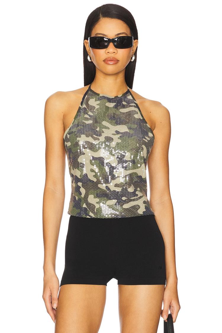 Shimmering sequin fabric brings a bold edge to this fitted camisole featuring a halter neck and open back with a tie-up and hidden side zipper closure. The waist-length silhouette showcases an all-over matte olive, black, and beige camouflage print, perfect for night out, girls night, or party occasions. Crafted from polyester, this midweight top blends trendiness with sexy street style vibes, making it a standout piece for versatile styling in all seasons.