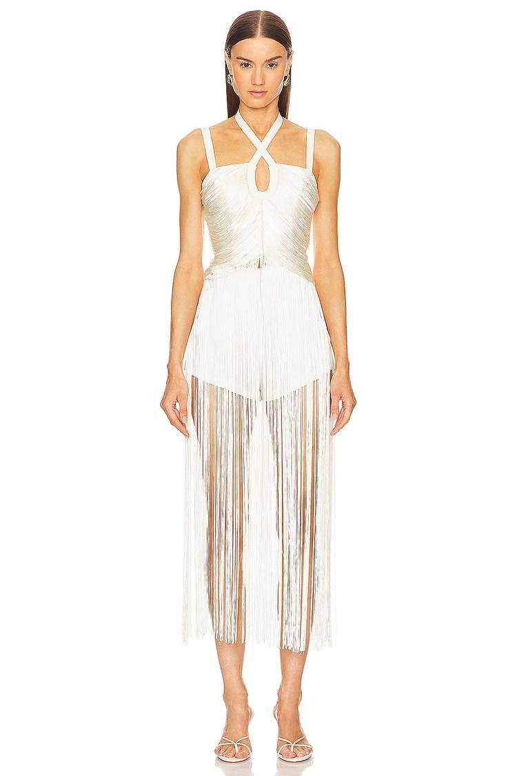 Turn heads in the Angelica Maxi Top, a white viscose showstopper that drifts with motion as you move. This Michael Costello design features crisscross front straps with a tie closure, a draped bodice and dramatic fringe trim that falls into artful, fluid lines. The back reveals an exposed zipper for a modern finish. Cut sleeveless with a halter-inspired neckline and a cropped silhouette that pairs slickly with shorts or sleek heels for a bold night-out look. Built for glamour, this piece is your center stage—effortless, daring, and undeniably chic for a cocktail or date-night moment.