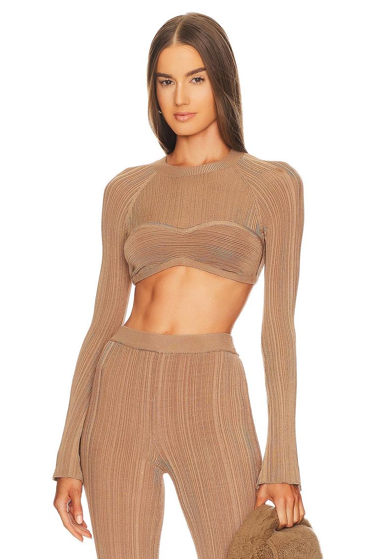 A sleek cropped top crafted from a ribbed jersey blend of viscose, nylon, and elastane offers a fitted silhouette with long sleeves and a classic crew neckline. Its contour bust design enhances the modern chic vibe, making it a versatile choice for casual outings, night outs, or brunch dates. The matte brown hue and ribbed texture add subtle sophistication, while the pullover style ensures easy wear. Pair it effortlessly with high-waisted bottoms for a confident, fashion-forward look.