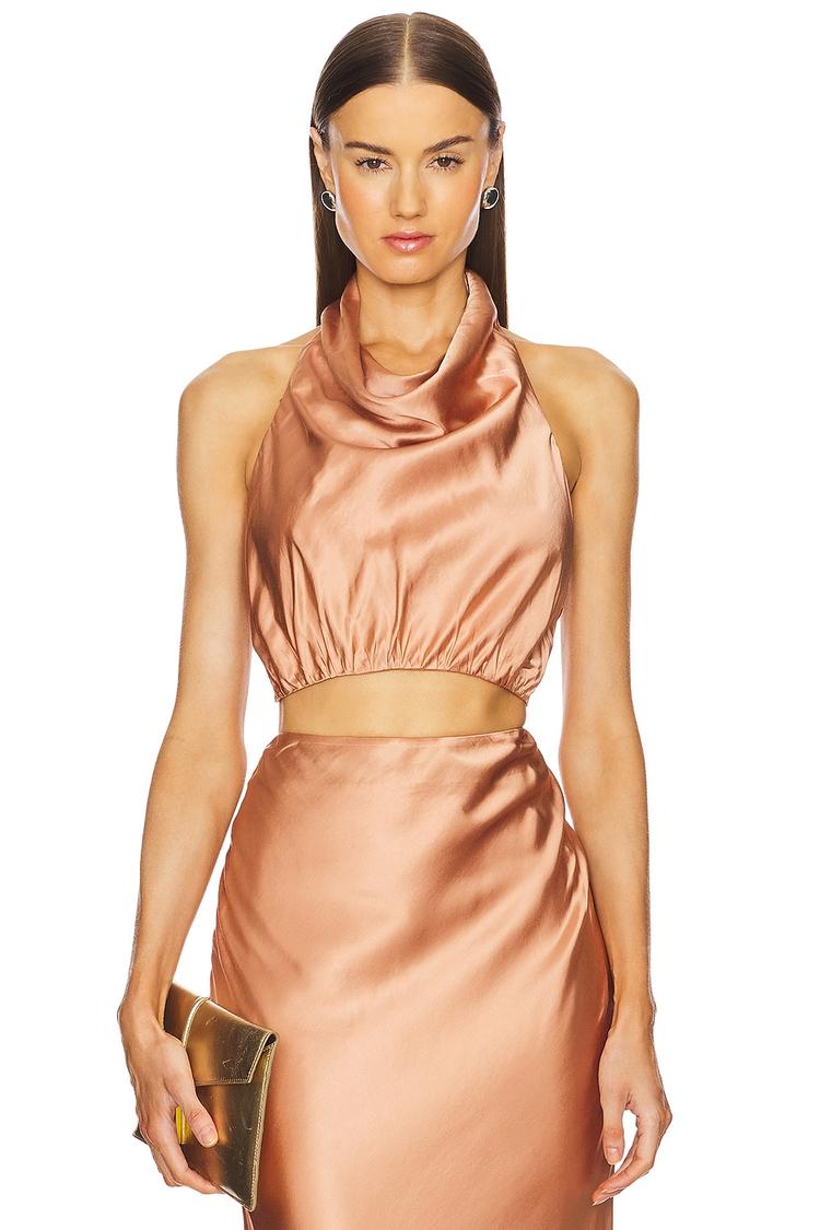Satin charmeuse fabric shimmers in a soft peach hue, shaping a fitted cropped top that highlights the waist. The halter neck and open back with a delicate tie-up closure add a sultry and modern edge, perfect for warm spring and summer evenings. Sleeveless and strapless styling enhances its elegant and sexy vibe, making it ideal for date nights, cocktail parties, or a chic night out. This Michael Costello piece pairs effortlessly with high-waisted skirts or pants for a sophisticated look that balances allure and refinement.