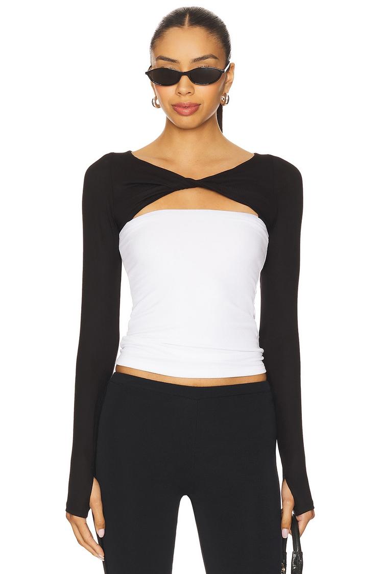 A sleek cropped top featuring a striking cut-out neckline and long fitted sleeves in matte black and white. Crafted from a midweight ribbed jersey blend of viscose and spandex, this minimalist design offers a modern, chic silhouette with a semi-sheer fabric texture. The pullover style and covered back enhance its easy wearability. Ideal for casual outings, everyday wear, and stylish brunches, this versatile piece balances comfort with contemporary edge for transitional seasons like spring, autumn, and winter.