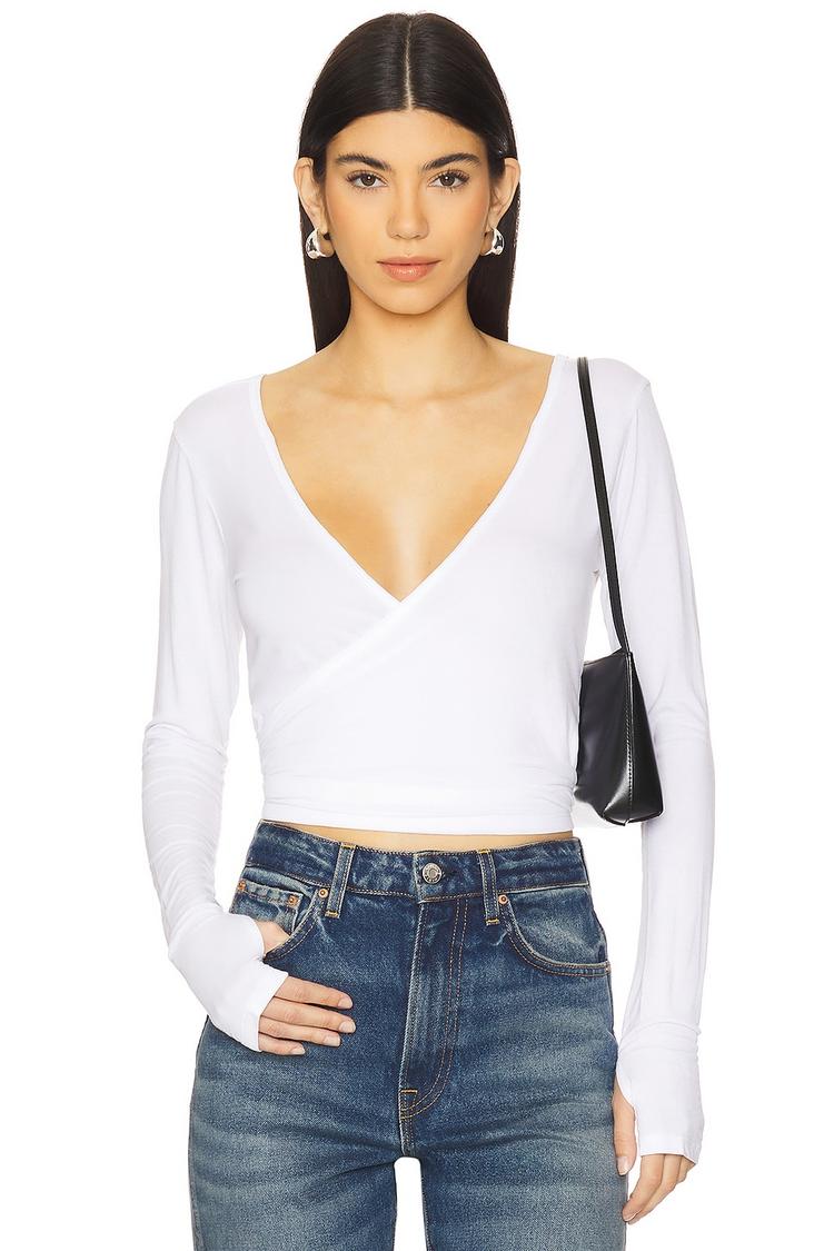 Softly structured with a fitted wrap silhouette, this waist-length top features a flattering V-neckline and long regular sleeves with thumb holes for subtle flair. Crafted from a midweight viscose-spandex blend, it offers comfortable stretch and a minimalist appeal. The covered back complements the clean front overlap, making it an ideal choice for casual outings, everyday wear, or relaxed brunches. Its crisp white hue adds a fresh, versatile touch that pairs effortlessly with denim or tailored bottoms.